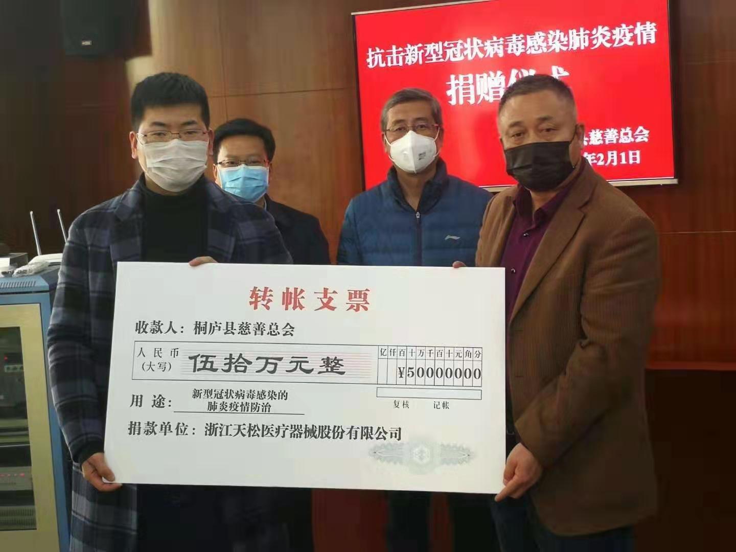 2月1日,浙江天松醫療器械股份有限公司向桐廬縣慈善總會捐贈50萬元人民幣,用于新型冠狀病毒感染的肺炎疫情防控工作,桐廬縣慈善總會領導現場接受公司捐贈。這筆捐款將主要用于購買抗擊疫情所急需的防護用品及藥品等物資。